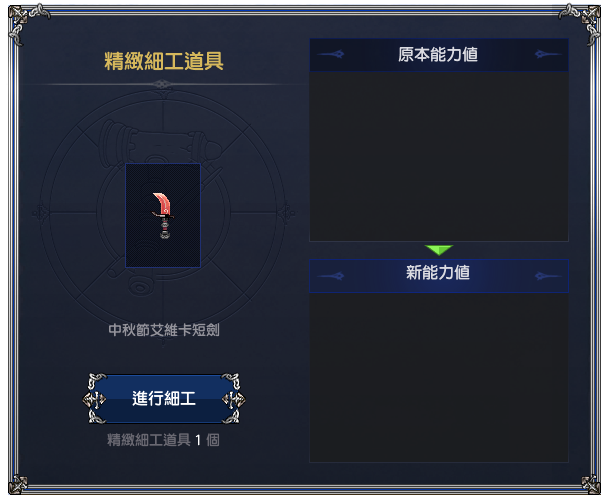 ▲細緻工匠,又簡稱細工,是一項強化裝備的系統,可賦予道具細工能力值,要進行此改造需要使用細緻工具,能力值在每次使用細工道具時將重新賦予。