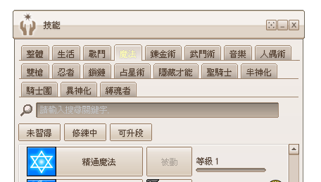 - 技能視窗的「全部」分頁與各才能分頁,將套用技能搜尋輸入視窗與篩選按鈕。