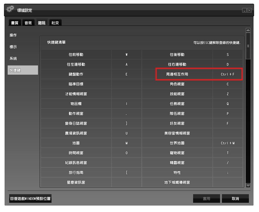 - 可於「環境設定」>「遊玩」>「快捷鍵」分頁中,變更指派給「周邊互動」的按鍵。