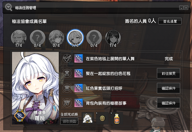 - 點擊「秘法協成員名單」公告板,可查看目前進行中的秘法任務資訊。