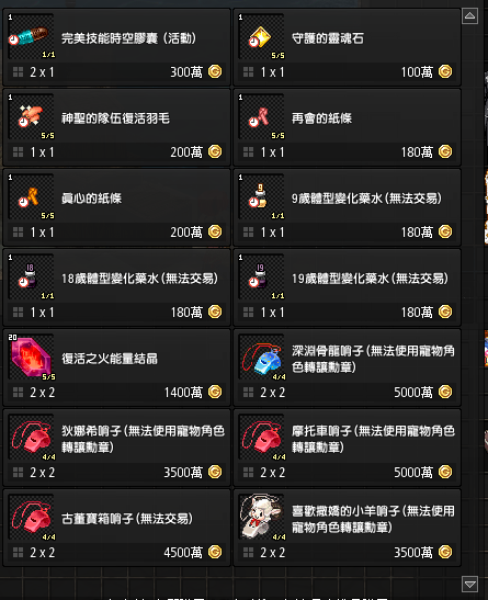 - 角色背包與拍賣場中持有的以下象徵道具將全部刪除:
