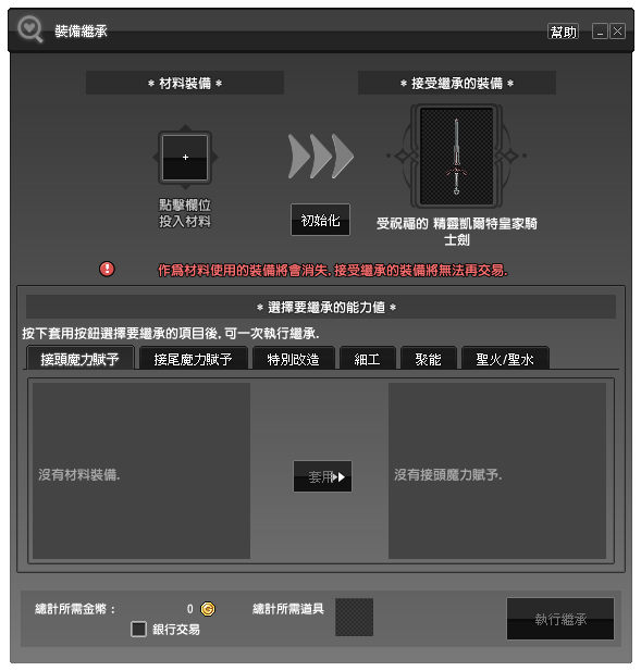 「裝備繼承」是讓一件裝備擁有的各種強化要素,轉移到另一件裝備上的功能。