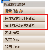 ▲玩家可在裝備上點擊右鍵,選擇作為「材料欄位」或「對象欄位」以進入裝備繼承介面。