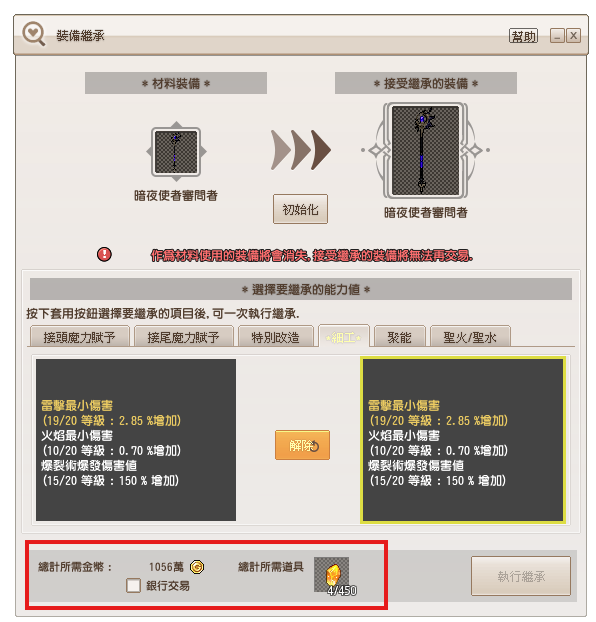 ▲每項強化要素皆可個別選擇是否繼承,費用依「繼承項目內容」與「目標裝備種類」而定,分別需要消耗的金幣與提煉結晶碎片有所不同,消耗金幣能使用銀行遠端交易。