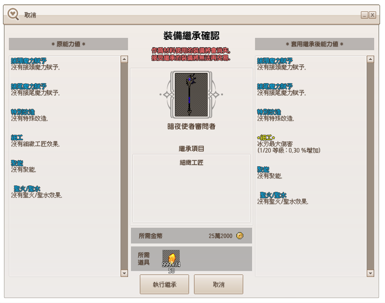 ▲確認繼承能力值後,會再出現原能力值與套用繼承後能力值,給予最後確認,確認過後即可點選執行繼承。