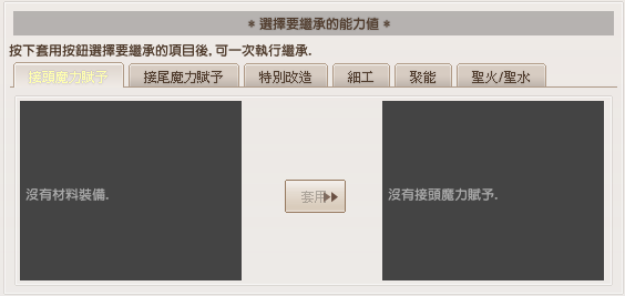 此系統僅適用於 武器與防具,且必須在 相同種類的裝備之間 才能進行繼承。
