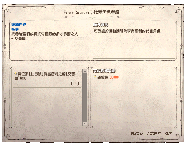 - 收到嚮導任務,向NPC「艾普蘭」並登記為活動代表角色