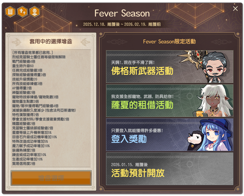 登記完活動角色後,點擊「Fever season」活動 UI 中的增益選擇按鈕,即可選擇欲套用的增益效果