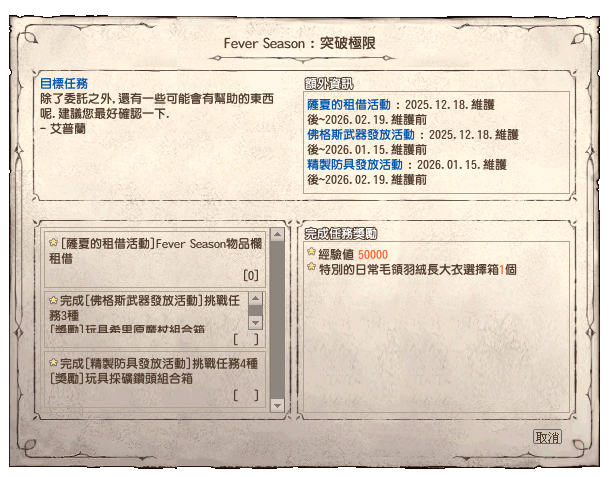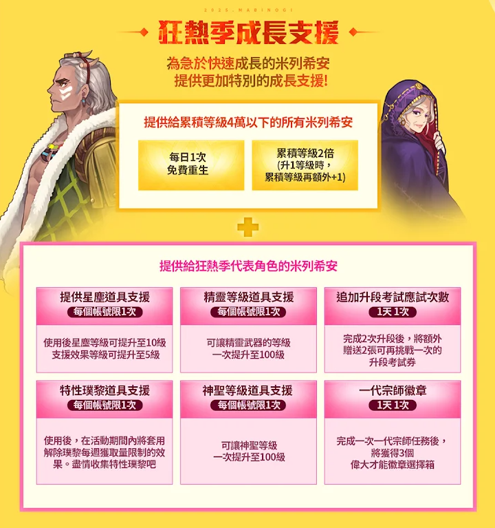 - 欲參加「Fever season」活動,需在同一帳號中至少持有 1 種秘法。若目前遊戲內尚未有擁有秘法的角色,請先進行「邁向更高境界的次元跳躍!」活動