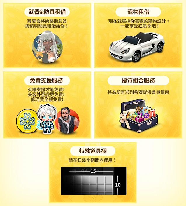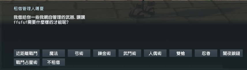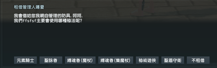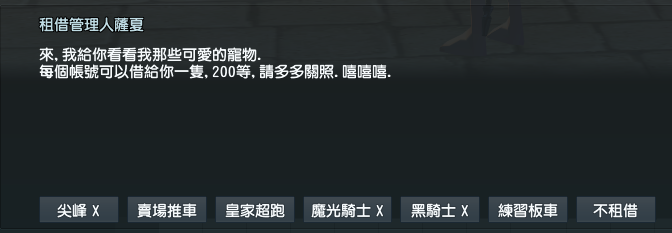 - 能夠透過NPC「薩夏」租借武器、防具、背包、寵物