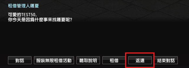 若想更換其他裝備,請與 NPC「租借管理人 薩夏」對話,選擇【返還】,歸還已租借的武器/服裝/寵物後,即可再次進行租借