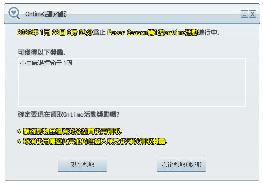 - 登入後會顯示 On-Time 活動確認畫面,選擇「立即領取」即可獲得獎勵