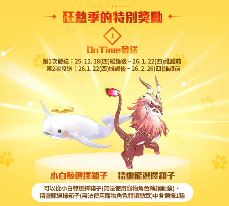 - 在活動期間內,登入遊戲即可獲得「鯨魚選擇箱」與「精靈龍選擇箱」。