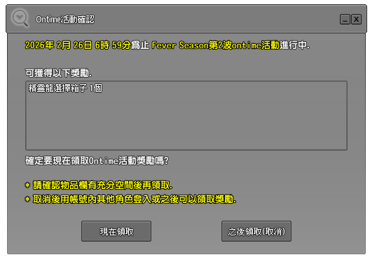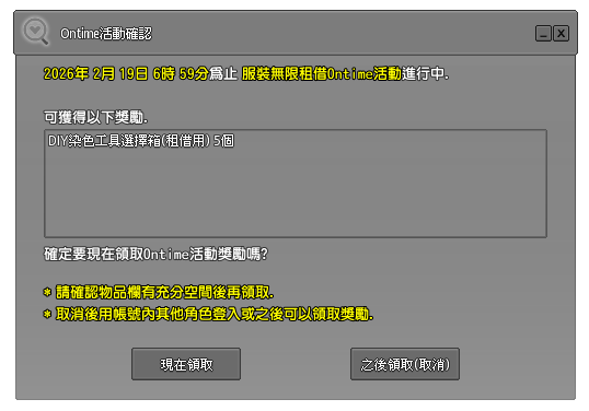 - 若點擊「稍後領取(取消)」,則不會領取獎勵並關閉確認畫面