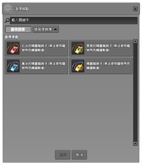 - 使用「精靈龍選擇箱子」可從以下道具中選擇 1 個獲得: