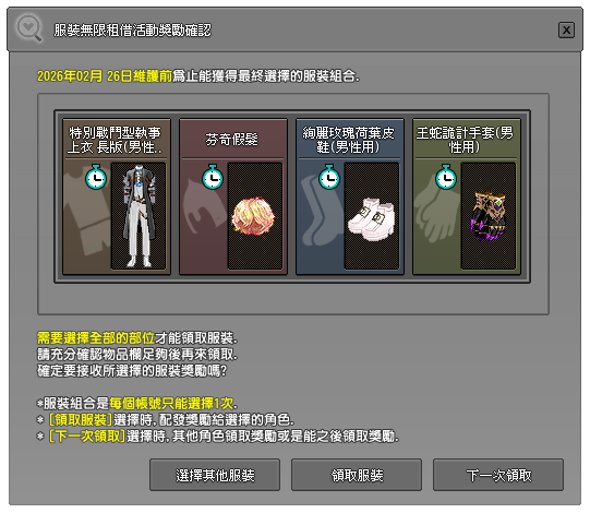 - 活動結束後,可選擇 1 套喜愛的服裝並永久獲得