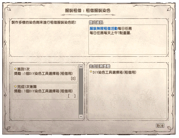 - 完成以下每日任務後,可獲得可用於為服裝染色的「DIY染色工具選擇箱(租借用)」