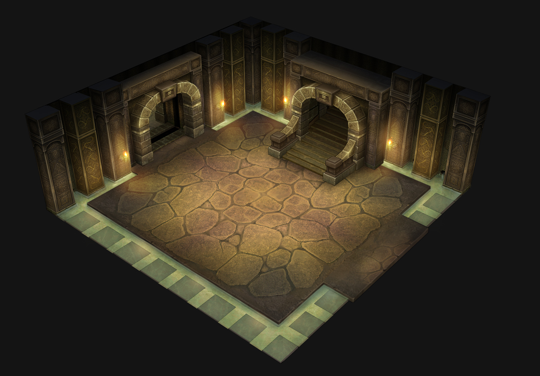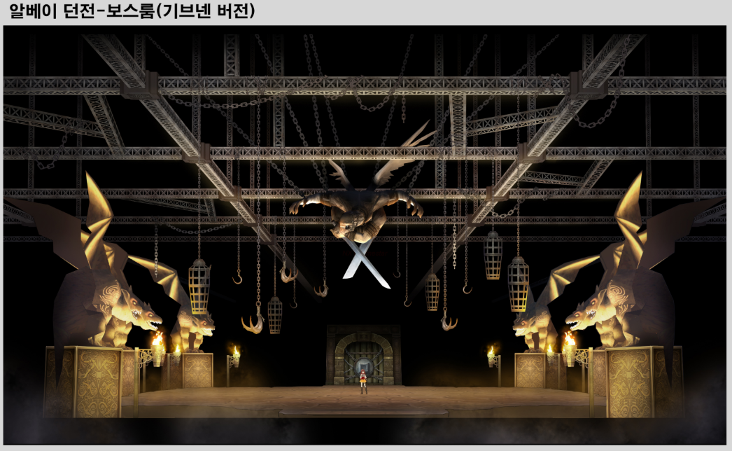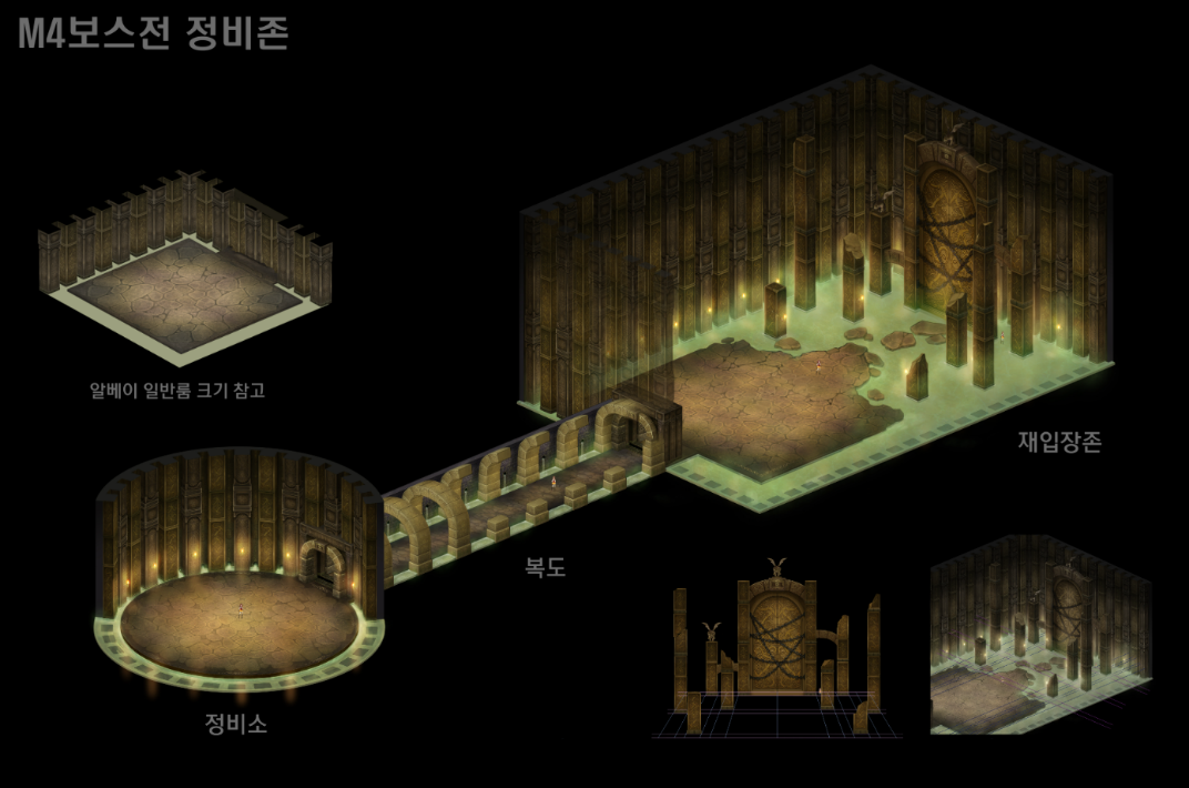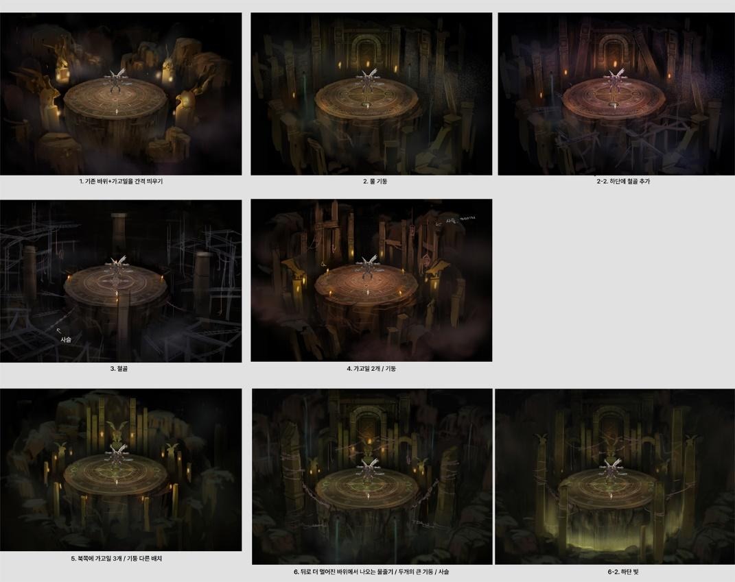整體概念配置上,我們採用了艾菲爾地下城華麗的柱子設計、走廊牆面上流動的水道設計,再搭配格里斯貝恩登場時,首領房間特有的鋼架結構,重新組合並摸索最適合的方向。