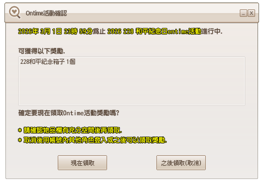 若當下登入的角色非領取角色,可以選擇”之後領取”,然後再登入需要領取的角色即可