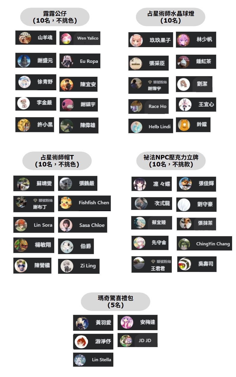 ※『露露公仔、占星術師帽T、占星術師水晶球燈』中獎者,因禮品價值達須報稅門檻,請填寫【新瑪奇祕法之源活動】中獎資料回填,表單中需上傳臉書帳號截圖、身分證正反面等個人資料